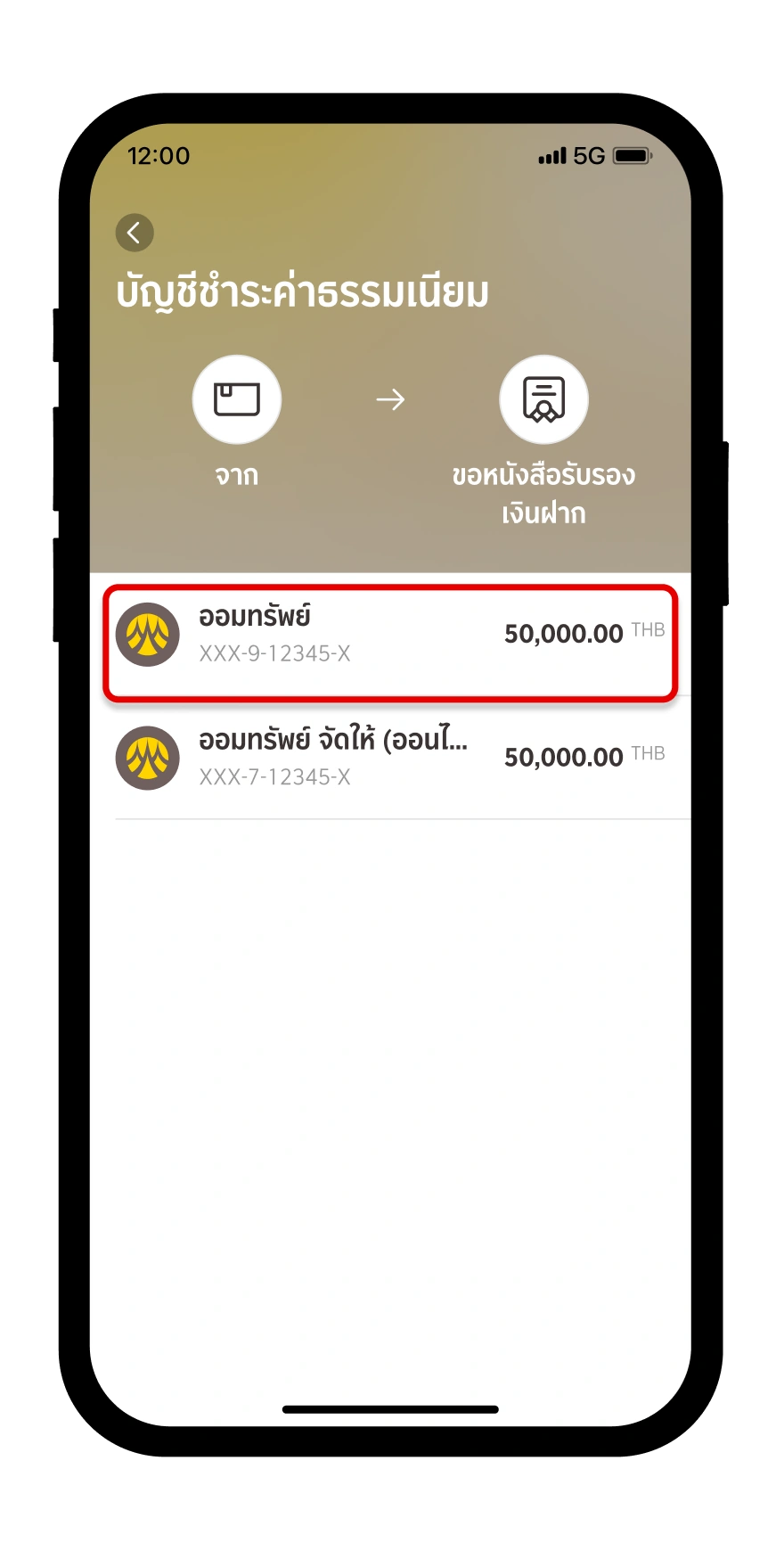 เลือกบัญชีที่ต้องการใช้ชำระค่าธรรมเนียม