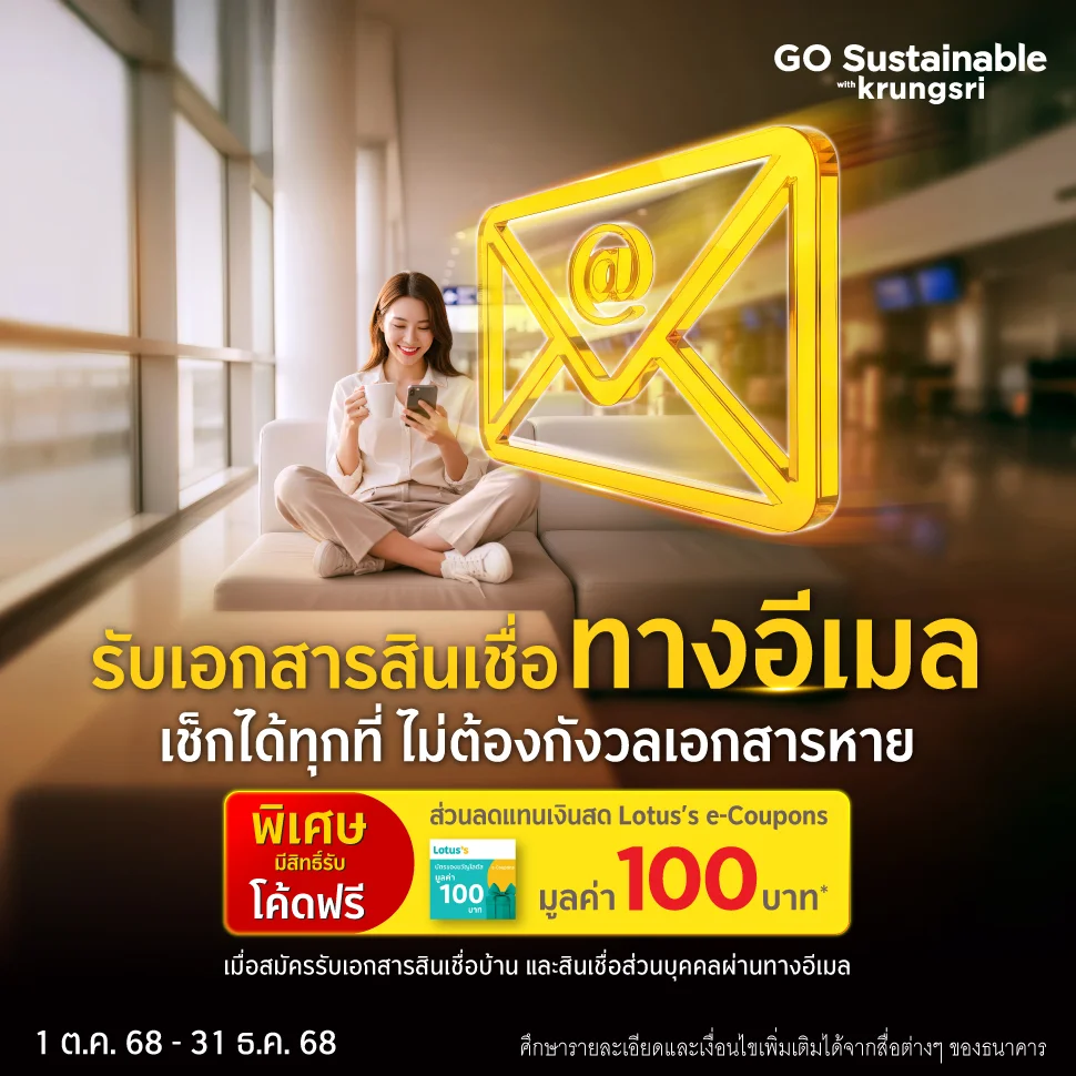 สำหรับลูกค้าที่สมัครรับเอกสารสินเชื่อบ้านกรุงศรี และ/หรือสินเชื่อหมุนเวียนส่วนบุคคลกรุงศรี ทางอีเมล และคลิกยืนยันอีเมลที่ได้รับจากธนาคารเรียบร้อยแล้ว ระหว่างวันที่ 1 พ.ค. 68 - 30 ก.ย. 68