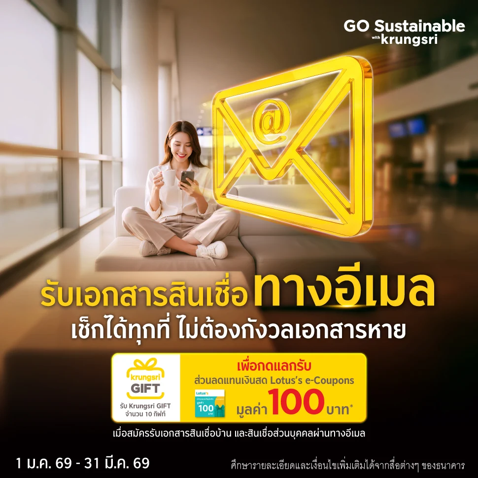 - สิทธิพิเศษสำหรับลูกค้าบุคคลธรรมดาที่มีบัญชีสินเชื่อบ้านกรุงศรี และ/หรือบัญชีสินเชื่อหมุนเวียนส่วนบุคคลกรุงศรีที่สมัครรับเอกสารสินเชื่อในรูปแบบอิเล็กทรอนิกส์ผ่านทางอีเมล และได้ทำการคลิกยืนยันขอรับ เอกสารสินเชื่อผ่านทางอีเมลที่ได้รับจากธนาคาร ระหว่างวันที่ 1 ม.ค. 69 – 31 มี.ค. 69 เท่านั้น