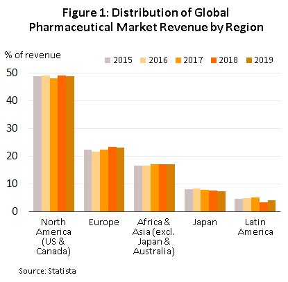 อุตสาหกรรมยาและเวชภัณฑ์เป็นอุตสาหกรรมที่ใช้เงินลงทุนสูงในการวิจัยและพัฒนาวัตถุดิบและตัวยาใหม่อย่างต่อเนื่อง ทำให้ฐานการผลิตยาและเวชภัณฑ์หลักของโลกโดยเฉพาะยาจดสิทธิบัตรหรือยาต้นแบบกระจุกตัวอยู่ในกลุ่มประเทศพัฒนาแล้ว ได้แก่ สหรัฐฯ ยุโรป และญี่ปุ่น ซึ่งมีศักยภาพทั้งด้านบุคลากร องค์ความรู้และเทคโนโลยีการผลิตขั้นสูง โดยประเทศเหล่านี้สามารถผลิตเพื่อส่งออกยาและเวชภัณฑ์ตอบสนองความต้องการในตลาดโลก (ภาพที่ 1) ขณะที่ประเทศกำลังพัฒนาส่วนใหญ่ยังเป็นเพียงผู้นำเข้ายาต้นตำรับ/ต้นแบบซึ่งมีราคาสูง