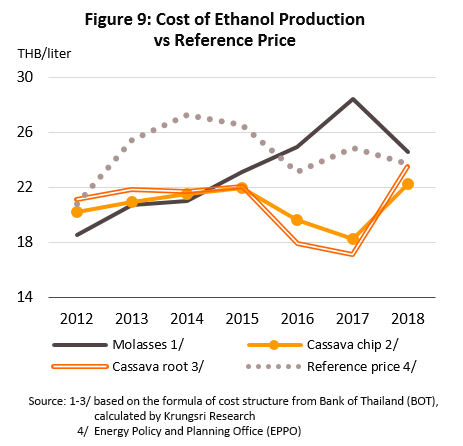 ผลประกอบการในปี 2561 ผู้ผลิตเอทานอลจากกากน้ำตาลมีผลประกอบการดีขึ้นเมื่อเทียบกับปี 2560 ขณะที่ผู้ผลิตเอทานอลจากมันสำปะหลังได้รับผลกระทบจากต้นทุนที่ปรับสูงขึ้นในปีนี้ แต่มาร์จินโดยรวมยังดีกว่าผู้ผลิตเอทานอลจากกากน้ำตาล (ภาพที่ 9)