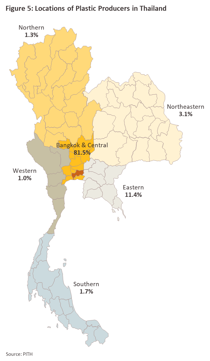 ผู้ประกอบการอุตสาหกรรมแปรรูปผลิตภัณฑ์พลาสติกในประเทศมีจำนวนมากกว่า 3,262 รายในปี 2565 ประมาณ 88.5% เป็นผู้ประกอบการขนาดกลางและเล็ก (SMEs) และ 11.5% เป็นผู้ประกอบการรายใหญ่ เนื่องจากการเข้าสู่ธุรกิจทำได้ไม่ยาก ใช้เงินลงทุนไม่มาก และเทคโนโลยีการแปรรูปฯ ยังอยู่ในระดับพื้นฐานและระดับกลาง ส่วนใหญ่เป็นการผลิตผลิตภัณฑ์พลาสติกที่ใช้งานทั่วไป (Commodity product) ภาวะการแข่งขันของธุรกิจจึงค่อนข้างรุนแรงและมีอัตรากำไรต่อหน่วย (Margin) ไม่สูงนัก ผู้ประกอบการส่วนใหญ่กระจุกตัวในภาคกลาง (79.6% ของจำนวนผู้ประกอบการทั้งหมด) โดยเฉพาะกรุงเทพฯ และปริมณฑล สมุทรปราการ และสมุทรสาคร รองลงมา คือ ภาคตะวันออก (12.4%) และภาคอีสาน (3.6%) (ภาพที่ 5) ผู้ประกอบการมากกว่าครึ่งอยู่ในอุตสาหกรรมบรรจุภัณฑ์ (51.8% ของผู้ประกอบการทั้งหมด) รองลงมา คือ กลุ่มเฟอร์นิเจอร์และของใช้ภายในบ้าน (12.3%) และไฟฟ้าและอิเล็กทรอนิกส์ (8.7%) ตามลำดับ