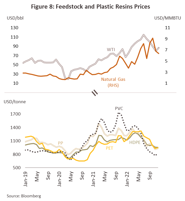 โดยทั่วไป โครงสร้างต้นทุนการผลิตของผลิตภัณฑ์พลาสติกประกอบด้วย วัตถุดิบ (เม็ดพลาสติก) 70% แรงงาน 10-15% พลังงาน 8% และอื่นๆ 7-12% สำหรับบรรจุภัณฑ์พลาสติก (มีมูลค่าการผลิตสูงที่สุด) มีต้นทุนหลัก ได้แก่ เม็ดพลาสติก (สัดส่วน 50-80% ของต้นทุนการผลิตทั้งหมด) ขณะที่ต้นทุนด้านพลังงานและแรงงานจะแตกต่างกันตามประเภทผลิตภัณฑ์และเม็ดพลาสติกที่ใช้ โดยบรรจุภัณฑ์พลาสติกที่ต้องใช้เทคโนโลยีการผลิตขั้นสูงและเครื่องจักรราคาแพง ต้นทุนค่าเสื่อมราคาและอัตราดอกเบี้ยจะมีสัดส่วนค่อนข้างสูง (ภาพที่ 7) สะท้อนว่าการเคลื่อนไหวของราคาน้ำมันดิบและก๊าซธรรมชาติจะส่งผลต่อโครงสร้างต้นทุนของผลิตภัณฑ์พลาสติกและความสามารถในการแข่งขันของอุตสาหกรรม