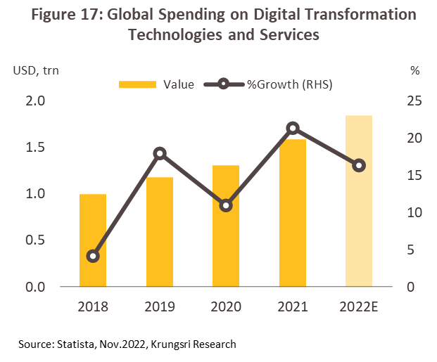 ตลาดโลก: ค่าใช้จ่ายด้านบริการเทคโนโลยีดิจิทัล (Spending on digital transformation technologies and services) เติบโตต่อเนื่องในอัตรา 21.4% ในปี 2564 และคาดว่าจะยังคงเพิ่มขึ้น 16.4% โดยมีมูลค่าประมาณ USD 1.9 trn. ในปี 2565 (ภาพที่ 17) ในจำนวนนี้สัดส่วนเกือบ 35% ของมูลค่าใช้จ่ายทั้งหมดอยู่ในประเทศสหรัฐฯ รองลงมา ได้แก่ตลาดยุโรป และจีน โดยค่าใช้จ่ายด้านบริการดิจิทัลส่วนใหญ่อยู่ในภาคการผลิตด้วยสัดส่วนเกือบ 30% ของค่าใช้จ่ายด้านดิจิทัลทั้งหมดของโลก รองลงไปได้แก่ ภาคธุรกิจบริการ ค้าปลีก และการเงิน ตามลำดับ (ภาพที่ 18) ปัจจัยหนุนมาจากการแข่งขันของบริษัทชั้นนำในทุกภาคธุรกิจทั่วโลกที่เน้นการใช้เทคโนโลยีดิจิทัลเพื่อขับเคลื่อนมูลค่าเพิ่มในการสร้างประสบการณ์ด้านการให้บริการออนไลน์ในรูปแบบใหม่ๆ แก่ลูกค้า (Customer experience transformation) ซึ่งต้องอาศัยระบบฐานข้อมูลขนาดใหญ่เพื่อใช้ประมวลความต้องการของตลาดที่เปลี่ยนแปลงในทุกขณะ (Real time) ทำให้ต้องมีค่าใช้จ่ายด้านระบบคลาวด์[2] ซึ่งเป็นโครงสร้างพื้นฐานสำคัญรองรับการพัฒนาและประยุกต์ใช้ซอฟต์แวร์และบริการบนซอฟต์แวร์ (Software as a service: SaaS) รวมถึงแพลตฟอร์มดิจิทัลต่างๆ ทำให้คาดว่า ค่าใช้จ่ายด้านระบบคลาวด์ของโลกในปี 2565 จะสูงถึง USD 490.3 bn. จาก USD 412.4 bn. ในปี 2564 หรือขยายตัวเฉลี่ย 18.8% (ภาพที่ 19)