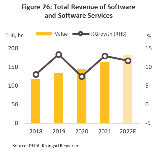 ส่วนรายได้ของธุรกิจที่ให้บริการซอฟต์แวร์ ธุรกิจบริการซอฟต์แวร์ทุกประเภทมีอัตราการขยายตัวสูงอยู่ในช่วงสูงกว่า 10.0% โดยเฉพาะธุรกิจการให้คำปรึกษาด้านซอฟต์แวร์ที่เติบโตถึง 19.3% ขณะที่ฐานรายได้ของธุรกิจให้บริการซอฟต์แวร์ส่วนใหญ่ (สัดส่วน 30.0% ของรายได้จากการให้บริการซอฟต์แวร์ทั้งหมด) มาจากธุรกิจการออกแบบและพัฒนาซอฟต์แวร์เพื่อใช้งานเฉพาะเจาะจง (Customization) รองรับความต้องการของภาคธุรกิจในช่วงของการเร่งปรับปรุงโครงสร้างภายในองค์กรสู่การบริหารข้อมูลบนฐานเทคโนโลยีระบบคลาวด์ และการใช้ซอฟต์แวร์เพื่อประเมินฐานลูกค้าเป้าหมายใหม่ๆ โดยเฉพาะช่องทางตลาดออนไลน์เพื่อพัฒนารูปแบบสินค้าที่หลากหลาย ส่วนการเติบโตของรายได้ในธุรกิจบูรณาการติดตั้ง (SI) ได้ปัจจัยหนุนจากการเติบโตของธุรกิจกลุ่ม SMEs ที่มีแผนยกระดับการบริหารจัดการองค์กรเพื่อเพิ่มขีดความสามารถในการแข่งขัน ตามนโยบายสนับสนุนจากภาครัฐโดยการลดหย่อนภาษี 2 เท่า(ไม่เกิน 100,000 บาท) ให้กับธุรกิจ SMEs สำหรับค่าใช้จ่ายด้านซอฟต์แวร์และบริการฯ ในปี 2564-2565 ทำให้คาดว่าปี 2565 ธุรกิจด้าน SI และ Customization จะยังเป็นแรงขับเคลื่อนหลักของการเติบโตด้านรายได้ในกลุ่มธุรกิจบริการซอฟต์แวร์