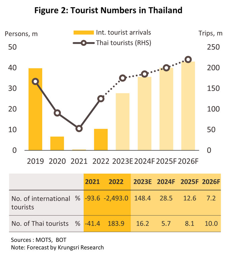 ในช่วง 9 เดือนแรก จำนวนนักท่องเที่ยวต่างชาติเพิ่มขึ้นอยู่ที่ 20.0 ล้านคน เทียบกับ 5.7 ล้านคนช่วงเดียวกันปีก่อน ปัจจัยสำคัญจาก (1) ทางการจีนทยอยอนุญาตให้นักท่องเที่ยวเดินทางออกนอกประเทศได้ตั้งแต่ต้นปี และ (2) การฟื้นตัวอย่างรวดเร็วของนักท่องเที่ยวมาเลเซีย เนื่องจากค่าใช้จ่ายท่องเที่ยวในไทยยังต่ำกว่าที่อื่น อย่างไรก็ตาม จำนวนนักท่องเที่ยวต่างชาติโดยรวมยังคิดเป็นสัดส่วนเพียง 67% ของช่วง 9 เดือนแรกปี 2562 (29.5 ล้านคน) โดยนักท่องเที่ยวมาเลเซียมาไทยมากที่สุด 3.3 ล้านคน (สัดส่วน 111% ของนักท่องเที่ยวมาเลเซียช่วง 9 เดือนแรกปี 2562) ตามด้วยจีน 2.5 ล้านคน (สัดส่วน 29%) และเกาหลีใต้ 1.2 ล้านคน (สัดส่วน 86%) ขณะที่นักท่องเที่ยวไทยเดินทางในประเทศ 128.2 ล้านทริป เพิ่มขึ้น 23.3% YoY โดยมีปัจจัยกระตุ้นจากวันหยุดยาวต่อเนื่อง 3 วันหลายช่วง รวมถึงมาตรการ “เราเที่ยวด้วยกันเฟส 5” (มีนาคม-เมษายน 2566)