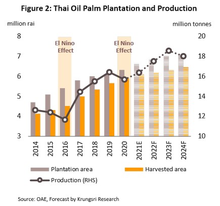 - ผลผลิตยางพารามีแนวโน้มขยายตัว 3.0-4.0% ต่อปี ปัจจัยหนุนจาก (1) การขยายพื้นที่ปลูกในช่วงหลายปีก่อนหน้า และ (2) แรงจูงใจจากราคายางที่ปรับเพิ่มขึ้นตามความต้องการทั้งในและต่างประเทศ
