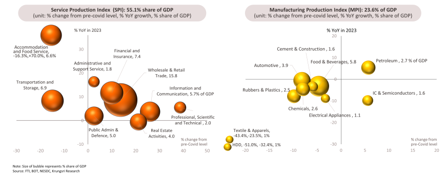 In 2023, overall manufacturing production shrank significantly by 5.1% and capacity utilization rate tumbled from the pre-Covid level (2016-2019) average, attributed to slow recovery of the domestic economy and weak foreign demand. For 2024, we anticipate a mild improvement in industrial production driven by improving exports and private investment amid the global economic recovery, along with domestic activities bolstered by strong growth of the tourism sector. However, manufacturing production growth would still be limited by structural problems, including lower competitiveness in some key industries.