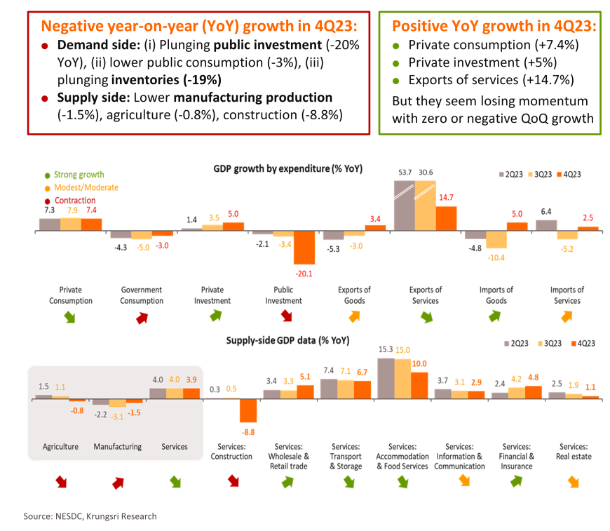 Business sentiment weakened in January, mainly in the trade sector, following an acceleration during the year-end festive season. However, there are positive signs of support for investment in the next period, including (i) applications for Board of Investment (BOI) investment incentives reached 848 bn baht in 2023, the highest in 5 years and an increase of 43% YoY. This was led by electrical appliances, electronics, automotive & parts, agriculture & food; (ii) measures to promote investments in target sectors, including the EV (electric vehicle) industry upgrade Phase 2 (EV 3.5) over 2024-2027 and (iii) accelerating infrastructure investment after the FY2024 annual Budget Bill takes effect in 2Q24. Premised on these, private investment would improve from 2Q24 onwards.