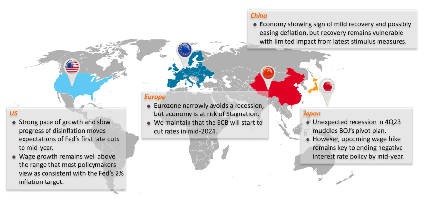 The IMF forecasts the global economy would grow by 3.1% in 2024 and inch-up to 3.2% in 2025. 2024 growth is 0.2 ppt higher that its previous projections last October, reflecting upgrades for China, the US, and large emerging market and developing economies. However, global growth forecasts for 2024 and 2025 are below historical (2000–19) annual average of 3.8%, reflecting restrictive monetary policies, withdrawal of fiscal support, and low underlying productivity growth. There are still lingering adverse risks to global growth, led by risk of commodity price spikes amid geopolitical and weather shocks. The Gaza-Israel conflict could escalate to the wider region, which produces about 35% of the world’s oil exports and 14% of gas exports. Continued attacks in the Red Sea and the ongoing war in Ukraine risk generating fresh adverse supply shocks to global recovery, with spikes in food, energy, and transportation costs.