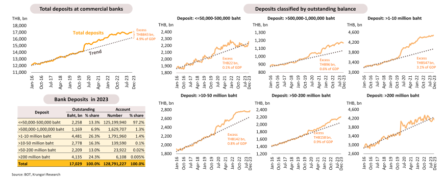 Total outstanding bank deposits reached THB17.03 trn at end-2023, rising 0.8% from the previous year and exceeding THB14.1 trn at end-2019 (pre-pandemic period). There was THB 843 bn excess deposits, accounting for 4.9% of GDP. Most of the excess savings are in deposit with outstanding balance of THB1-10 mn per account and amounting to THB 547 bn (3.1% of GDP), implying high purchasing power for middle- and upper-income earners. This excess deposits would allow certain household groups to increase spending but the number of deposit accounts in these groups (over 500,000-baht per account) is less than 4 million, which is low relative to Thailand’s 70 million population. Additionally, most of the low- and middle-income groups (below 500,000-baht per account) have run down their savings and might still struggle with spending ahead