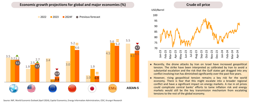The IMF has slightly revised up 2024 global economic growth projection by 0.1 percentage point to 3.2%, reflecting upgrades for the US and some large emerging markets. The latest 2024 global growth forecast is the same pace as in 2023 but remains below the historical (2000-2019) annual average of 3.8%, owing to near-term factors, such as still-high borrowing costs and withdrawal of fiscal support, and longer-term effects from the Covid-19 pandemic and Russia’s invasion of Ukraine; weak growth in productivity; and increasing geoeconomic fragmentation. In addition, the IMF’s latest forecast of global growth five years from now – at 3.1% -- is at its lowest in decades. Downside risks could stem from rising geopolitical tensions, high interest rates, China’s troubled property sector, high government debt and intensifying geoeconomic fragmentation.