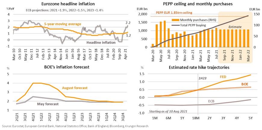 The ECB has announced adjustments on its forward guidance to boost inflation. They stated interest rates would remain at present or lower levels until inflation is forecast to hit or slightly surpass 2%. According to the ECB’s current projections, inflation rate would remain below 2% at least until 2023, implying they would not hike rates over the next 2 years. To reach the new inflation target and prevent the economy from stumbling due to the delta variant risks, the ECB’s commitment to purchase bonds “at a significantly higher pace” than 1Q21, would be extended to the end of the year instead of September. The purchases could hit the PEPP ceiling in 1Q22 and could prompt the ECB to ramp up its Asset Purchase Program in 2Q22. The UK is running a different show. After full reopening since July 19, rising demand and labor shortage are threatening inflation. The BOE’s August projections show inflation could peak in 4Q21 at 4% before dropping to 2% in 2023. Fears of inflation spike could pressure the BOE to lead a curve of raising rates before the Fed, and taper QE as well. They plan to taper when the benchmark interest rate hits 0.5%, which could happen in 1H23, and to sell assets when the rate hits 1%. The latest outbreak and inflation concerns would be the main challenges and would influence the ECB’s and BOE’s policy decisions for the rest of the year.