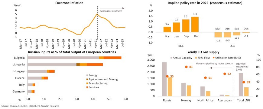 Strong inflation data in the first month of 2022 and better-than-expected economic growth could pressure the ECB to terminate all asset purchase schemes in 3Q and deliver two interest rates hikes in 4Q totaling 50 bps. We expect a shift in forward guidance to a more hawkish tone starting March, and the ECB might prudently follow the Fed and BOE to enter a tightening cycle. However, there is additional risk from Russia and West tensions. Output in several European countries, especially Eastern Europe, relies on Russian inputs, especially energy, primary commodities and basic manufactured products. If Russia imposes sanctions on Europe, the economy could be disrupted. The impact on general goods would be limited but its reliance on Russian energy (major share of input) could elevate risks. In 2021, Russia exported 1,700 TWh of natural gas to the EU, only half of the EU’s annual capacity to import natural gas. Even if the EU has large idle capacity, it would be difficult to increase gas supply due to higher imported prices and limited domestic production capacity. This implies measures to increase supply might not be enough, so it is crucial to manage demand by controlling consumption of households and factories. Halting Russian energy exports would increase cost of living, trigger higher inflation, and encourage a more aggressive ECB stance.