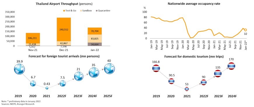 - Domestic tourism slowed down in January and occupancy rate is expected to drop to 32% from 37% in December. However, we project domestic tourism would increase to 90 mn trips in 2022 (from 53 mn trips in 2021), supported by easing containment measures, mass vaccination program, and government incentives to boost domestic tourism, including Phase 4 of ‘We travel together’ program (THB9 bn budget, effective February-July 2022), ‘Tour Tiew Thai’ campaign (THB1 bn) which has been extended to May 2022 (originally scheduled to expire in February).