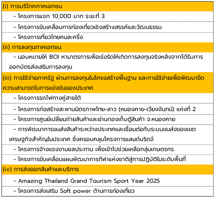 โครงการกระตุ้นเศรษฐกิจข้างต้น สำหรับบางโครงการมีความชัดเจนบ้างแล้ว เช่น ดิจิทัลวอลเล็ต เฟส 3 ส่วนโครงการอื่นๆที่เกี่ยวข้องกับการบริโภคและการท่องเที่ยว คาดว่าจะทยอยมีรายละเอียดมากขึ้น อย่างไรก็ตาม ด้านการลงทุนภาครัฐคาดว่าต้องอาศัยเวลากว่าจะเห็นผลเชิงบวกต่อเศรษฐกิจ ส่วนโครงการด้านการลงทุนภาคเอกชนและด้านการส่งออกสินค้ายังมีความไม่ชัดเจนท่ามกลางปัญหาเชิงโครงสร้างและความเสี่ยงจากสงครามการค้าที่มีแนวโน้มทวีความรุนแรง