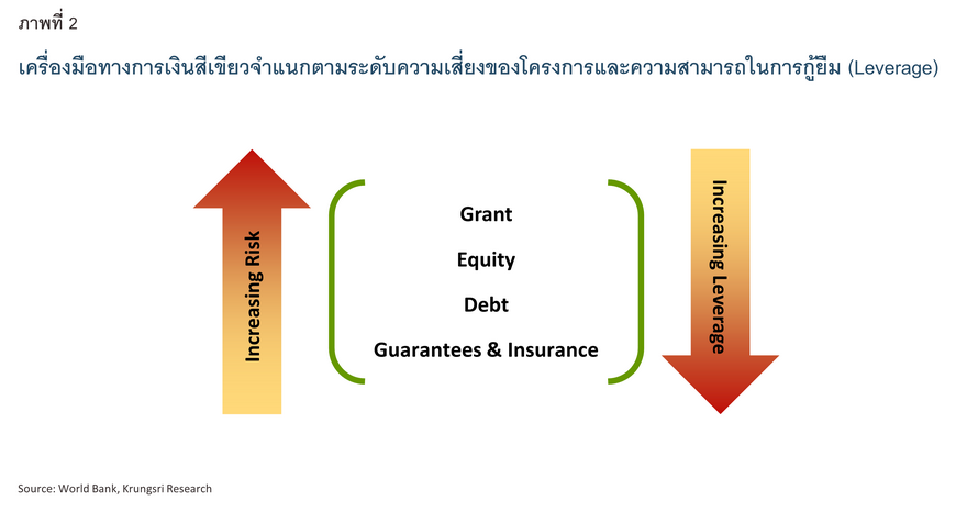 ความต้องการเงินทุนลักษณะที่แตกต่างกันของแต่ละภาคส่วนนำมาซึ่งการพัฒนาเครื่องมือทางการเงินสีเขียวเพื่อตอบโจทย์การลงทุนเพื่อสิ่งแวดล้อมในรูปแบบต่างๆ ซึ่งธนาคารโลกและ Climate Bonds Initiative (CBI)5/ ได้จำแนกประเภทเครื่องมือทางการเงินสีเขียวไว้ ดังนี้