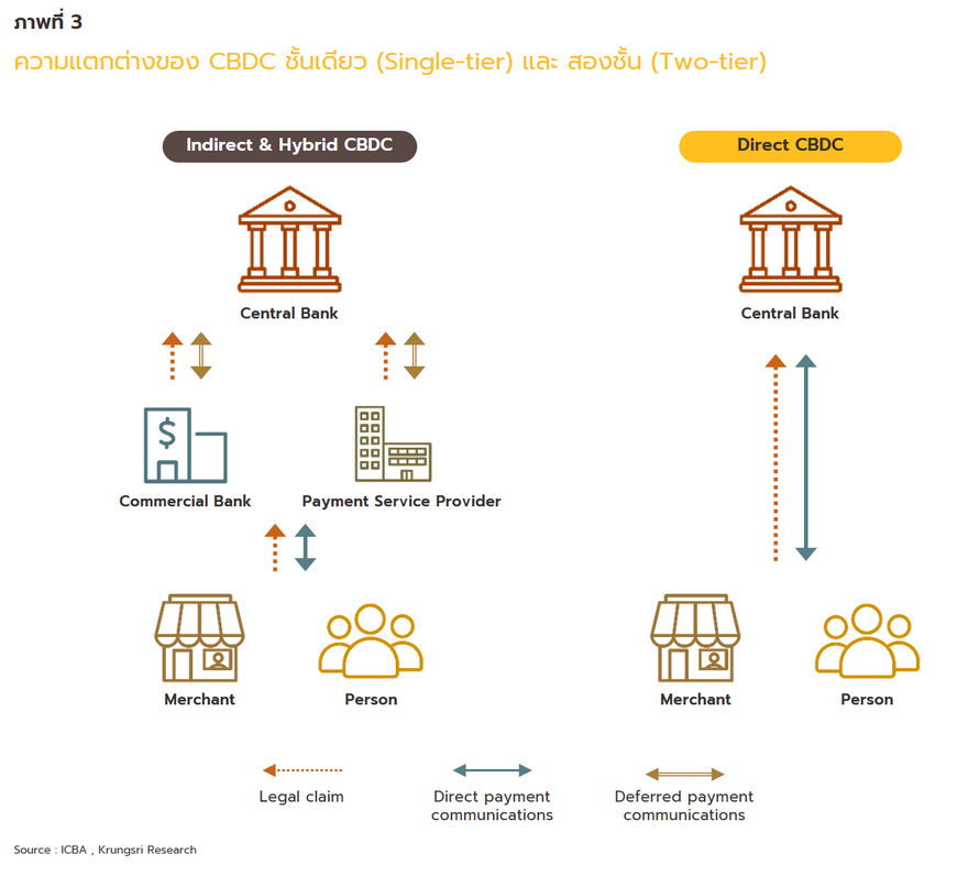 4) ระดับการมีส่วนร่วมของภาคเอกชนในการดำเนินการ: CBDC แบบชั้นเดียว (Single-tier) และแบบ 2 ชั้น (Two-tier)