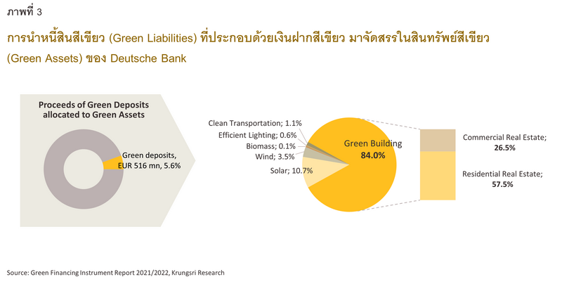 ธนาคารยักษ์ใหญ่ในประเทศเยอรมนี Deutsche Bank นำเสนอผลิตภัณฑ์เงินฝากสีเขียวในปี 2564 ให้แก่ลูกค้านิติบุคคล โดยมีระยะเวลาการฝากเงินไม่เกิน 12 เดือน ซึ่งโครงการที่มีสิทธิ์ได้รับการสนับสนุนมีทั้งหมด 5 กลุ่ม8/ อันได้แก่ พลังงานหมุนเวียน การปรับปรุงประสิทธิภาพพลังงาน เทคโนโลยีสารสนเทศและการสื่อสาร การขนส่งที่สะอาด และอาคารสีเขียว โดยโครงการหลักที่ธนาคารให้การสนับสนุนผ่านผลิตภัณฑ์ทางการเงินสีเขียวซึ่งประกอบด้วยเงินฝากสีเขียวคือกลุ่มอาคารสีเขียวทั้งที่อยู่อาศัยและอสังหาริมทรัพย์เพื่อการพาณิชย์ ซึ่งในช่วงตั้งแต่ต้นเดือนมกราคม 2564 จนถึงสิ้นเดือนมิถุนายน 2565 ธนาคารได้รับเงินฝากสีเขียวทั้งสิ้น 516 ล้านยูโร