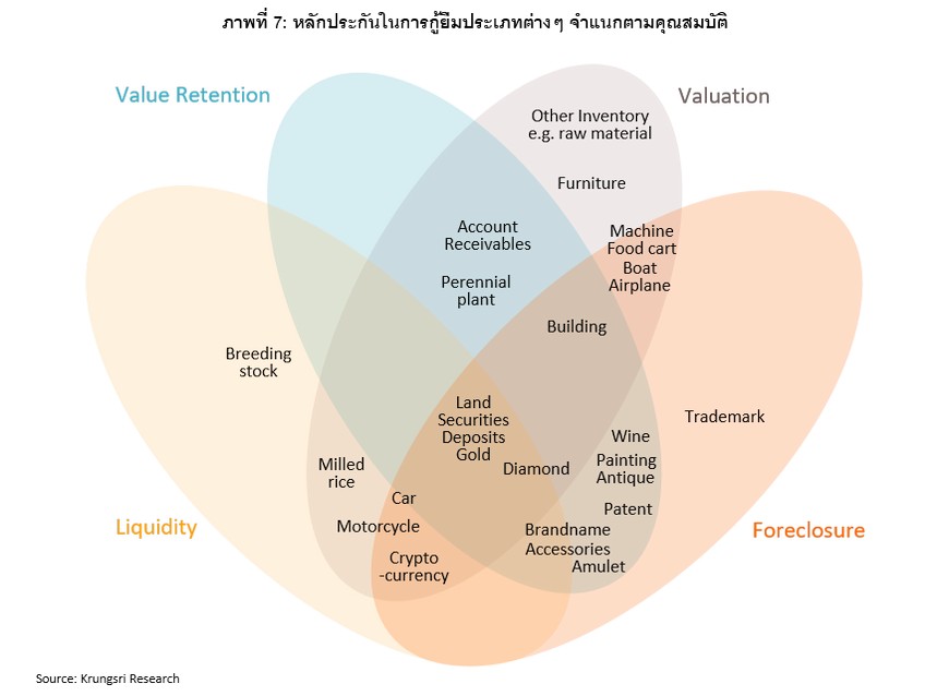 เมื่อพิจารณาจากคุณสมบัติทั้ง 4 ด้านนี้ เราจะเห็นได้ว่าผู้ให้กู้มักนิยมหลักประกันซึ่งมีคุณสมบัติครบทั้ง 4 ข้อเป็นอันดับแรก อาทิ สินทรัพย์ทางการเงินที่มีสภาพคล่องสูง เช่น หลักทรัพย์ บัญชีเงินฝาก แล้วจึงตามมาด้วยที่ดิน ก่อนที่จะพิจารณาสินทรัพย์ประเภทอื่นๆ ที่มีคุณสมบัติไม่ครบทุกข้อ เช่น สิ่งปลูกสร้าง รถยนต์ (มีคุณสมบัติ 3 ด้าน) เครื่องจักร กระแสรายได้จากลูกหนี้การค้า (มีคุณสมบัติ 2 ด้าน) และสินค้าคงคลัง (เฉพาะ Valuation) ซึ่งจะเห็นได้ว่านอกจากสินทรัพย์ทางการเงินที่มีสภาพคล่องสูงและทองคำซึ่งมีค่าใช้จ่ายในการเก็บรักษาแล้ว มีเพียงที่ดินเท่านั้นที่สามารถตอบโจทย์ได้ครบทุกด้าน (ภาพที่ 7)