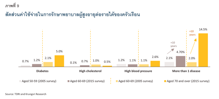 ต้นทุนการดูแลสุขภาพผู้สูงอายุเป็นความท้าทายทั้งระดับครัวเรือนและระดับประเทศ โดยจากข้อมูลของประเทศญี่ปุ่น พบว่า ค่าใช้จ่ายด้านสุขภาพของคนญี่ปุ่นจะเริ่มเพิ่มขึ้นอย่างรวดเร็วหลังจากอายุ 50 ปี และจะเร่งสูงขึ้นต่อเนื่องในช่วงอายุถัดๆ ไป19/ เช่นเดียวกับในกรณีของไทย โดยการศึกษาของ TDRI พบว่า สัดส่วนค่าใช้จ่ายในการรักษาโรคเบาหวานต่อรายได้จะเพิ่มเป็น 2 เท่าเมื่อผู้สูงวัยมีอายุเพิ่มขึ้น 10 ปี แต่หากผู้สูงอายุมีโรคประจำตัวมากกว่า 1 โรค ภาระค่าใช้จ่ายจะยิ่งเร่งสูงขึ้น กล่าวคือ ขณะที่ผู้สูงวัยมีอายุ 60-69 ปี ครัวเรือนจะเผชิญค่าใช้จ่ายราว 2% ของรายได้ แต่เมื่อมีอายุตั้งแต่ 70 ปีขึ้นไป สัดส่วนค่าใช้จ่ายจะเพิ่มเป็น 14.5% หรือเพิ่มกว่า 7 เท่า20/ (ภาพที่ 9)