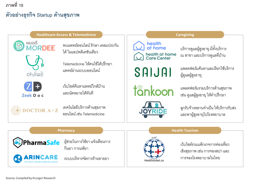 เป็นที่แน่นอนว่าสังคมผู้สูงอายุจะมาพร้อมกับความต้องการสินค้าและบริการทางสุขภาพที่เติบโตขึ้น ดังนั้นธุรกิจที่เกี่ยวข้องกับสุขภาพจึงมีโอกาสอันดีท่ามกลางการขยายตัวของตลาด Silver Generation โดยธุรกิจโรงพยาบาล และศูนย์ดูแลสุขภาพจะได้รับอานิสงส์จากสังคมสูงวัย โดยเฉพาะกลุ่มผู้สูงอายุและครอบครัวที่มีกำลังซื้อสูง ทั้งนี้ แนวโน้มการดูแลสุขภาพเชิงป้องกัน (Preventive Medicine) และการดูแลสุขภาพเชิง Wellness ซึ่งเน้นการป้องกันมากกว่าการรักษาโรค จะได้รับความสนใจมากขึ้น นอกจากนี้ ธุรกิจสุขภาพยังมีโอกาสจากการใช้เทคโนโลยีเข้ามาช่วยตอบสนองความต้องการของผู้สูงอายุและผู้รับบริการในด้านต่างๆ ดังนี้ (ภาพที่ 18)